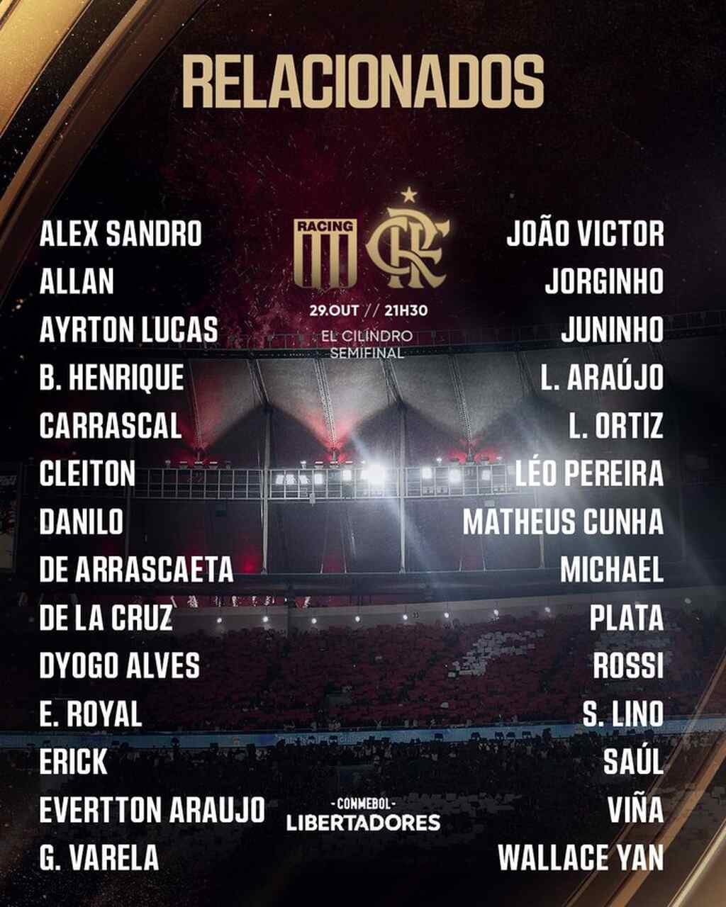O Flamengo divulgou os jogadores relacionados para a partida contra o Racing, na quarta-feira (27), às 21h30 (de Brasília), em Buenos Aires, pelo jogo de volta da semifinal da Libertadores. O técnico Filipe Luís conta com o retorno do zagueiro Léo Ortiz, porém não terá à disposição o atacante Pedro.