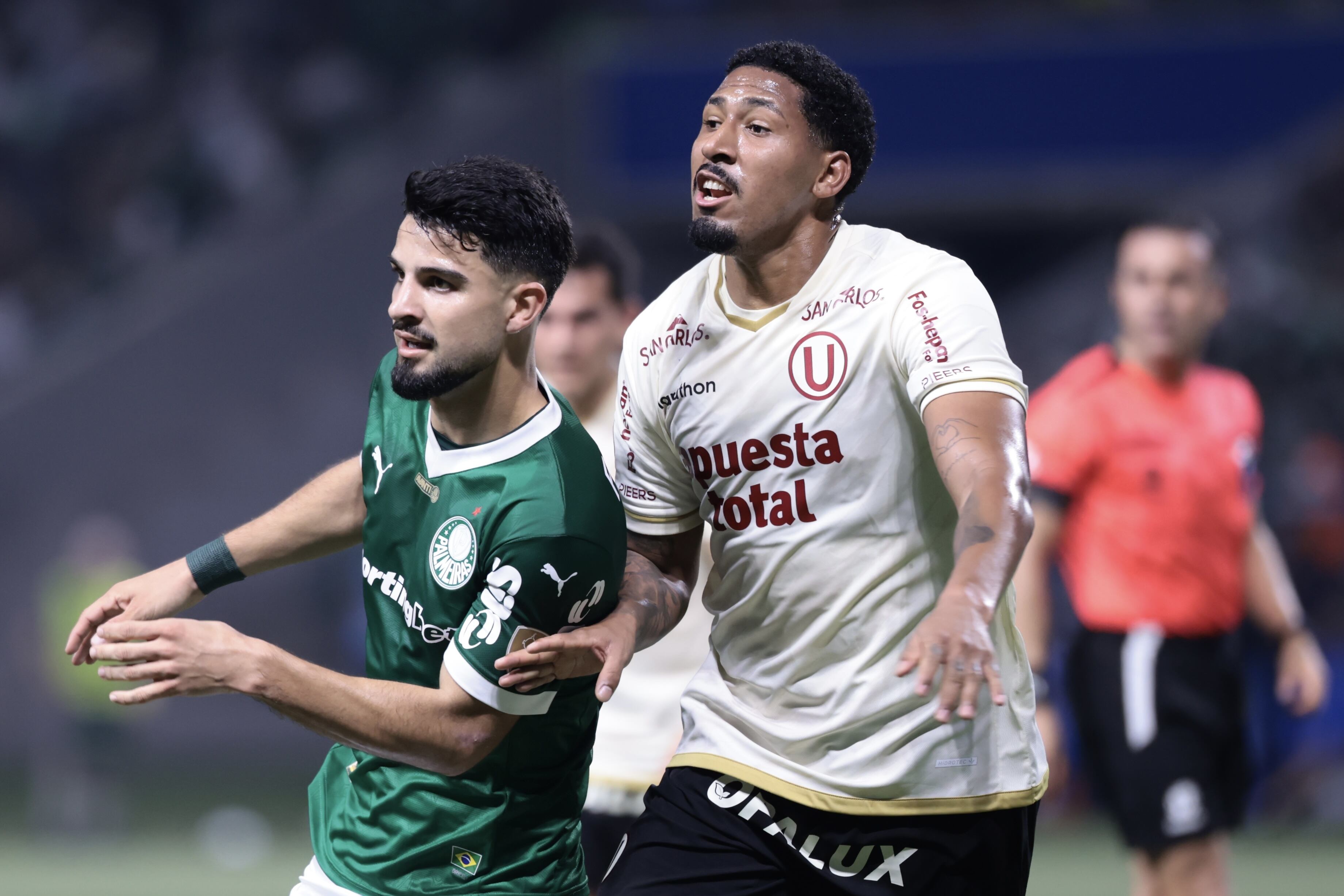Aos poucos, a equipe de Abel Ferreira começou a trocar passes e encurralar o adversário. O trio de zaga, no entanto, reduziu a velocidade do time, que teve dificuldade para superar a linha defensiva do Universitario. Apenas nos minutos finais da primeira etapa o Alviverde teve sua primeira grande oportunidade, quando Allan venceu a disputa com os zagueiros peruanos e cabeceou com força na trave.