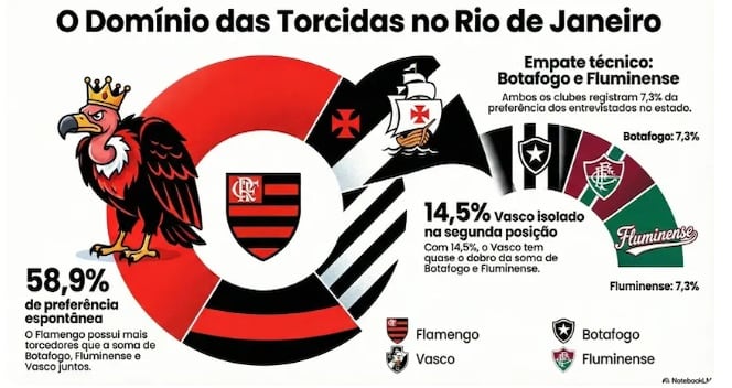 A hegemonia do Flamengo se estende por todos os recortes da pesquisa. Na divisão por sexo, o clube tem 57,7% da preferência das mulheres e 60,3% no público. Já o Vasco registra 13,9% no público feminino e 15,2% no masculino, refletindo sua posição como segunda força entre as torcidas no Rio de Janeiro.