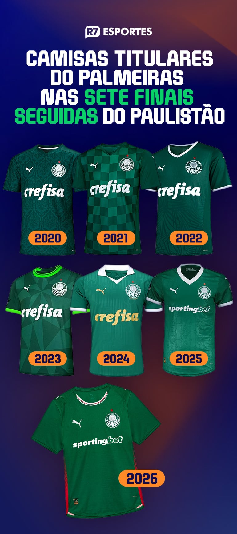 De 2020 para cá, o Verdão vestiu seis modelos diferentes de camisas titulares. O sétimo vai a campo hoje (4), contra o Novorizontino, pelo primeiro jogo da final.
